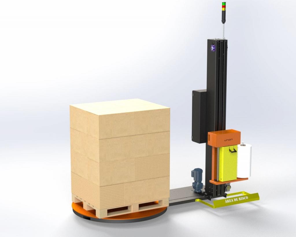 Material: Aço Carbono, acabamento em esmalte sintético; Altura total de embalagem: 2500mm, torre com 3 metros; Capacidade de pallet: Até 2000 kg; Controle de velocidade: 0 a 13 RPM dependendo do filme e qualidade; Partida e parada indexada no mesmo ponto; Sensor de altura de pilha do pallet (Sensor óptico) para identificação automática; Contador de voltas e programa de número de voltas em cima e embaixo; 2 entradas de empilhadeira; Treinamento no local e instalação (custo adicional para localidades fora da Capital ou Grande São Paulo); Tensão: 220V monofásico ou trifásico (informar tensão existente no local); Sistema de pré-estiramento automático com regulagem eletrônica (até 300% dependendo do filme e qualidade).
